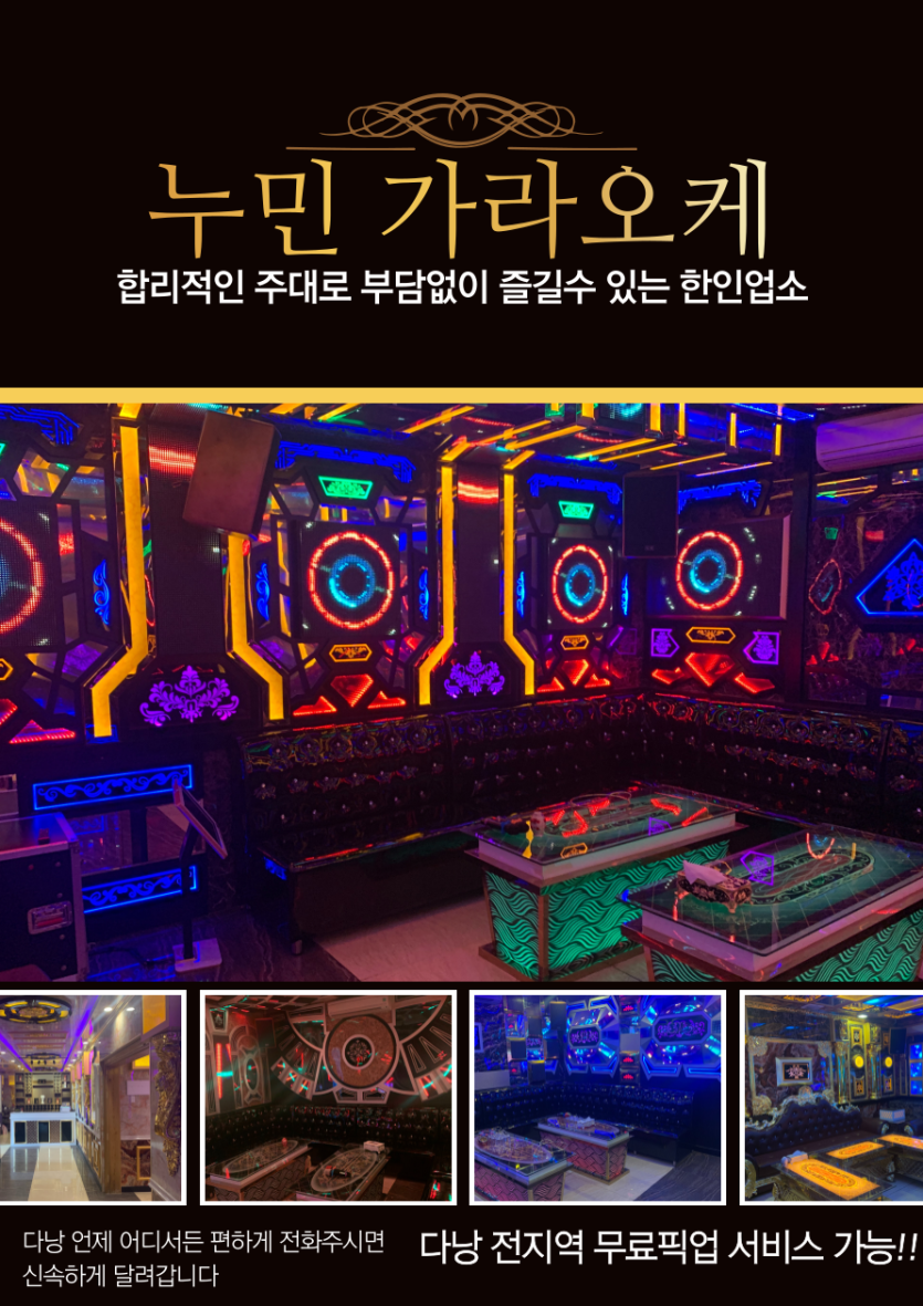 누민 다낭 가라오케 KTV는 총 6층에 14개의 넓은 룸과 함께 현대적인 음향 및 조명 시스템을 갖추고 있으며 특히 베트남 기준으로는 새벽 늦게까지 영업하는 좀처럼 보기 드문 업소임을 꼭 기억해 두시기 바랍니다. 클래식한 스타일과 화려한 조명이 어우러진 현대적인 모습으로 꾸며져 있습니다.